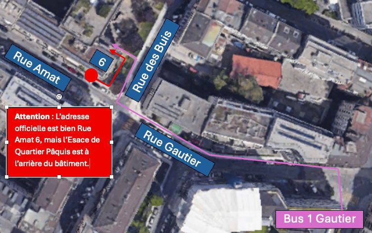 Espace de Quartier Pâquis qui nous accueil tous les mercredis de 08:45 à 10:45 est situé à l’angle de la rue Jean-Charles-Amat 6 et la rue des Buis.